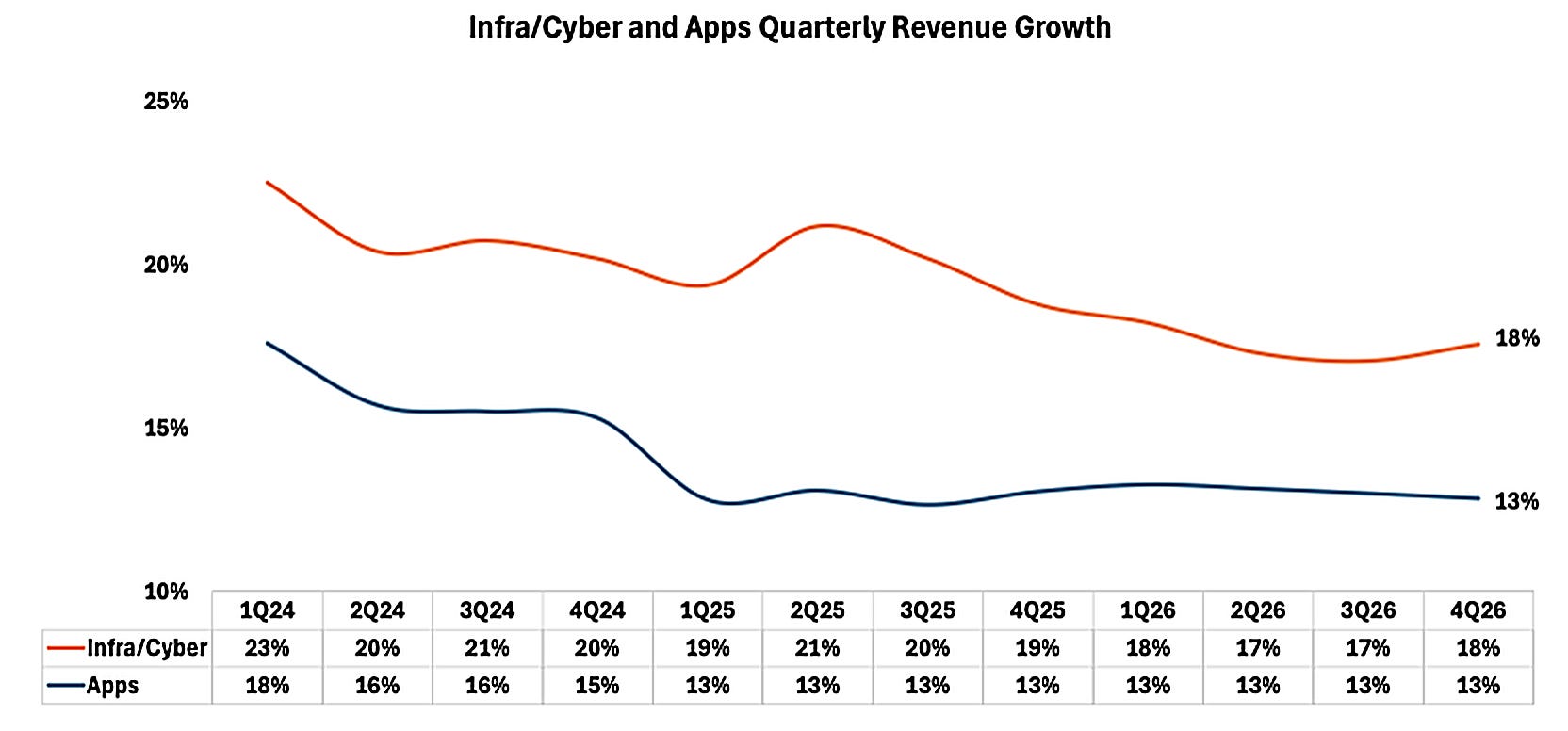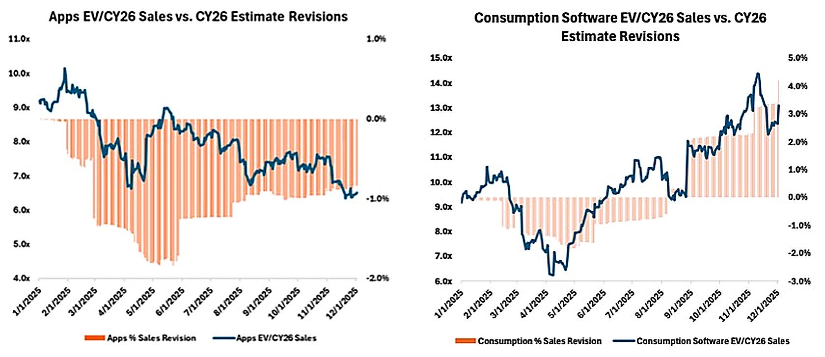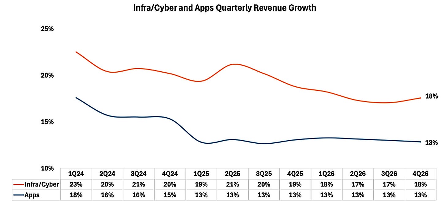 As the two charts above show, among publicly-traded software businesses, infra/cyber stocks have out-grown their application-layer counterparts. Even more importantly, the forward-year growth estimates for consumption software (i.e. infra) have been revised up vs. application software which have been revised down (although only slightly).