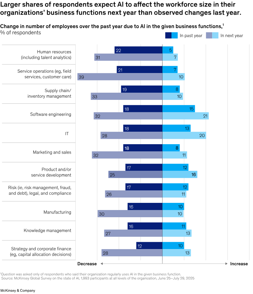 The impact of reduced hiring will be felt strongest in coordination-heavy roles that exist to move information and manage project hand-offs. Back-office operations like supply chain, risk, customer support, and HR ops are all functions that stand out as being relatively more affected due to AI according to a recent McKinsey study. And 2026 is expected to see meaningfully more impact than 2025.