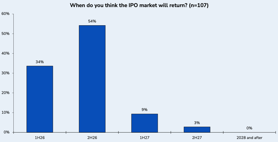 While many expect 2026 to be a hot market for IPOs, I expect many of the most in-demand privately held companies will hold off on going public. This runs counter to the view held by public market investors, who in the survey below from Wolfe Research, overwhelmingly stated they expect the IPO market to return in 2026.