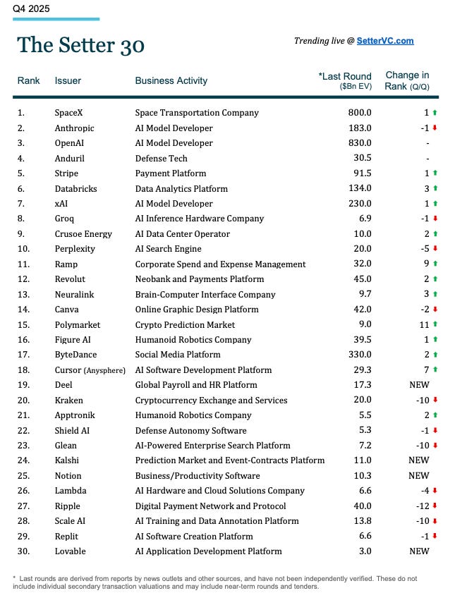 The below chart is from Setter Capital, a secondaries platform that helps connect buyers and sellers of privately held stock in hot companies like SpaceX and OpenAI. They publish a quarterly list of the top 30 most in-demand startups among private investors.