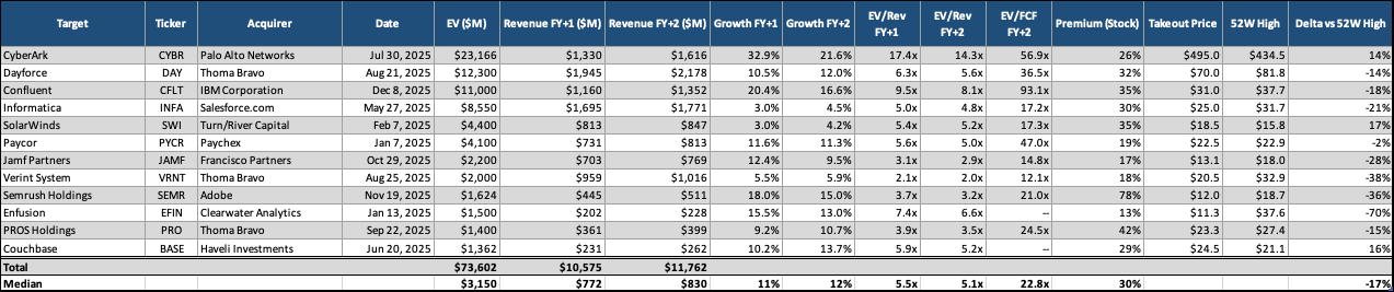 In the chart below, I highlight the most significant acquisitions of public software companies. The median EV-to-revenue take-out multiple was 5.5x, with the median forward-year growth rate being 11% Y/Y.