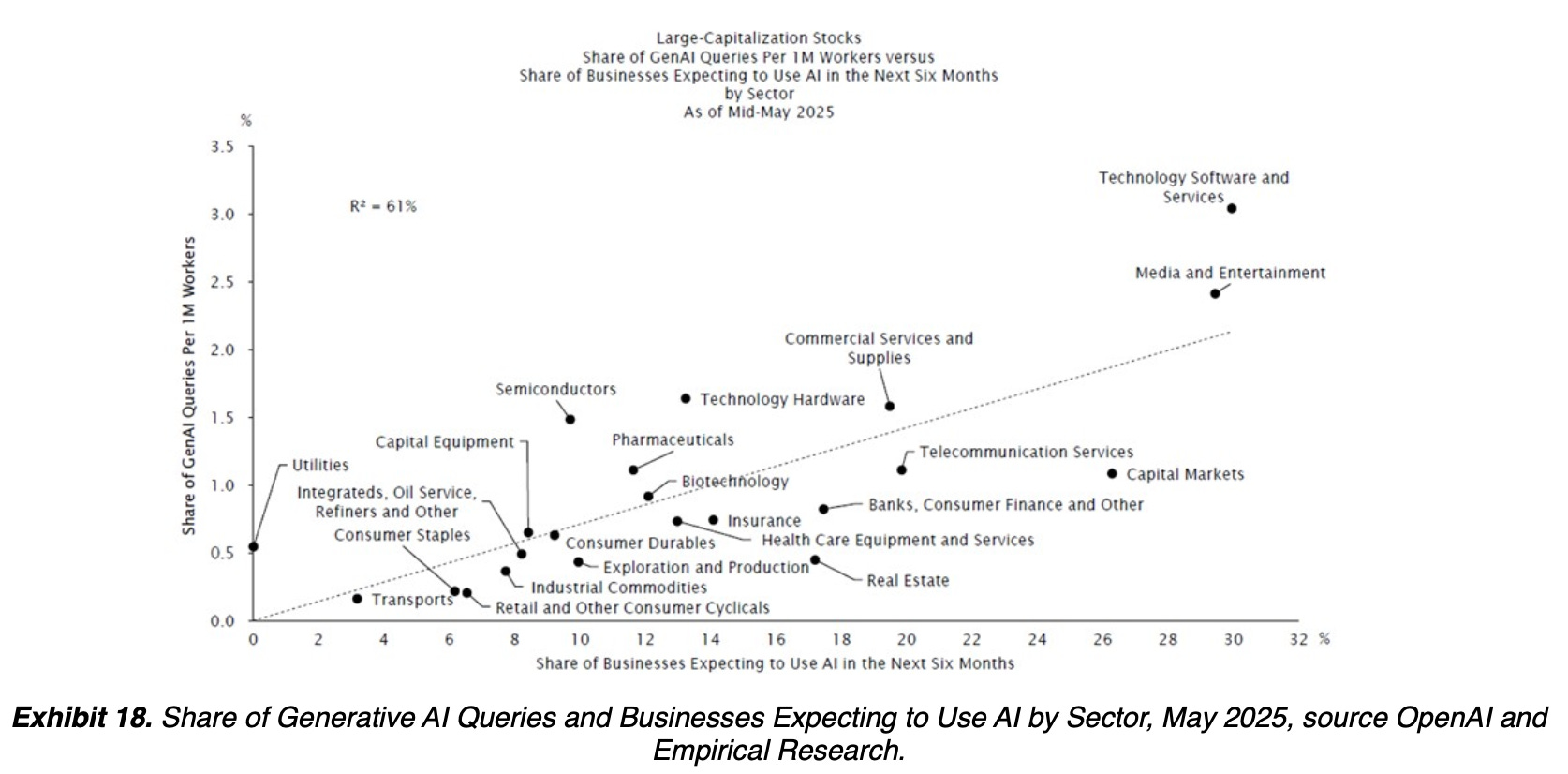 In the above chart, the X-Axis shows AI penetration - the share of businesses in a given industry expected to use AI in the next 6 months. The Y-Axis shows AI usage intensity - the share of GenAI Queries per 1M workers. Tech-forward industries that operate using lots of data - tech, media, capital markets, telecom, banking, commercial services - are the furthest along in adopting AI in their business. The laggards include transportation, utilities, oil companies, and retailers.
