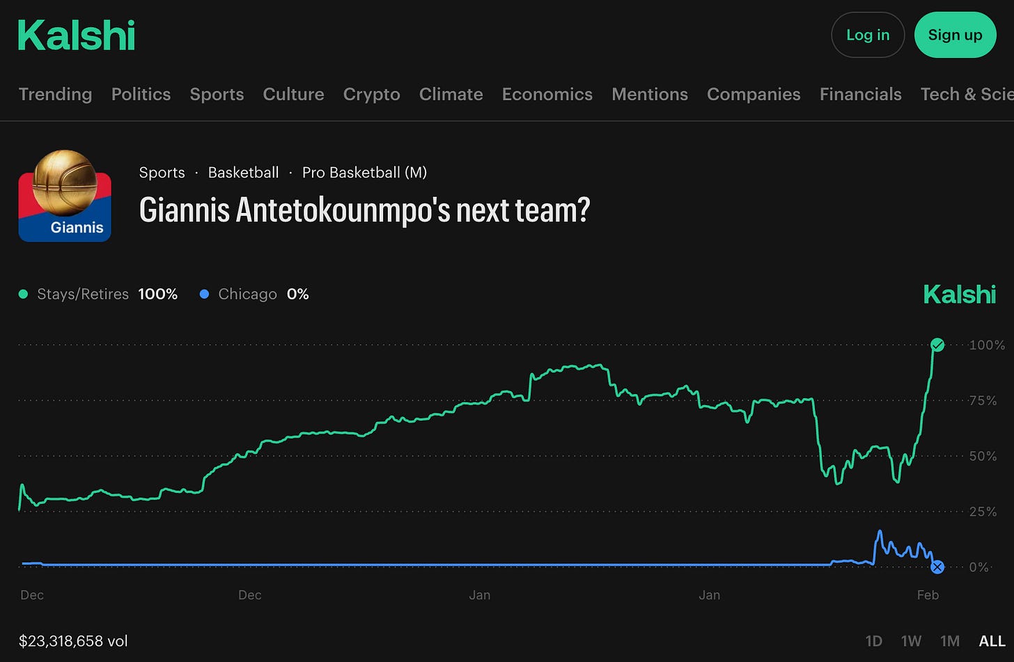 The Kalshi odds of Giannis staying in Milwaukee began plummeting, falling from 78% to 45% in a single day, and then hit 38%. Over 200,000 contracts were traded on the platform. By January 30th, Giannis’ trade situation was the highest volume contract on Kalshi.