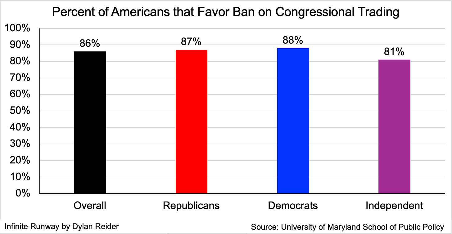 Less than 20% of Americans say they trust Congress to do the right thing. That disastrous erosion of institutional trust has been supported by, among many other things, the fact that our representatives are allowed to trade stocks using information they receive as part of their job in Congress.