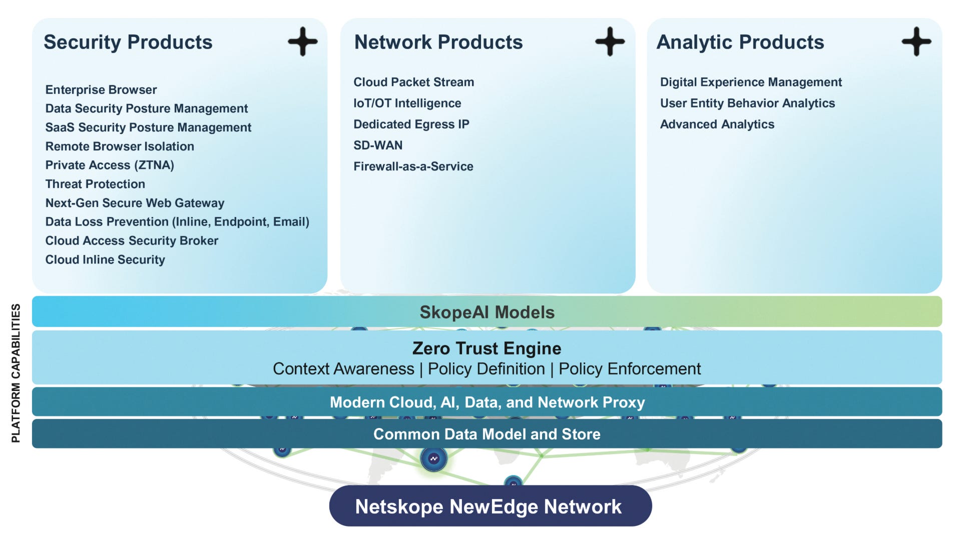 Netskope One is a product portfolio including over 20 individual product modules, broken down into three categories: