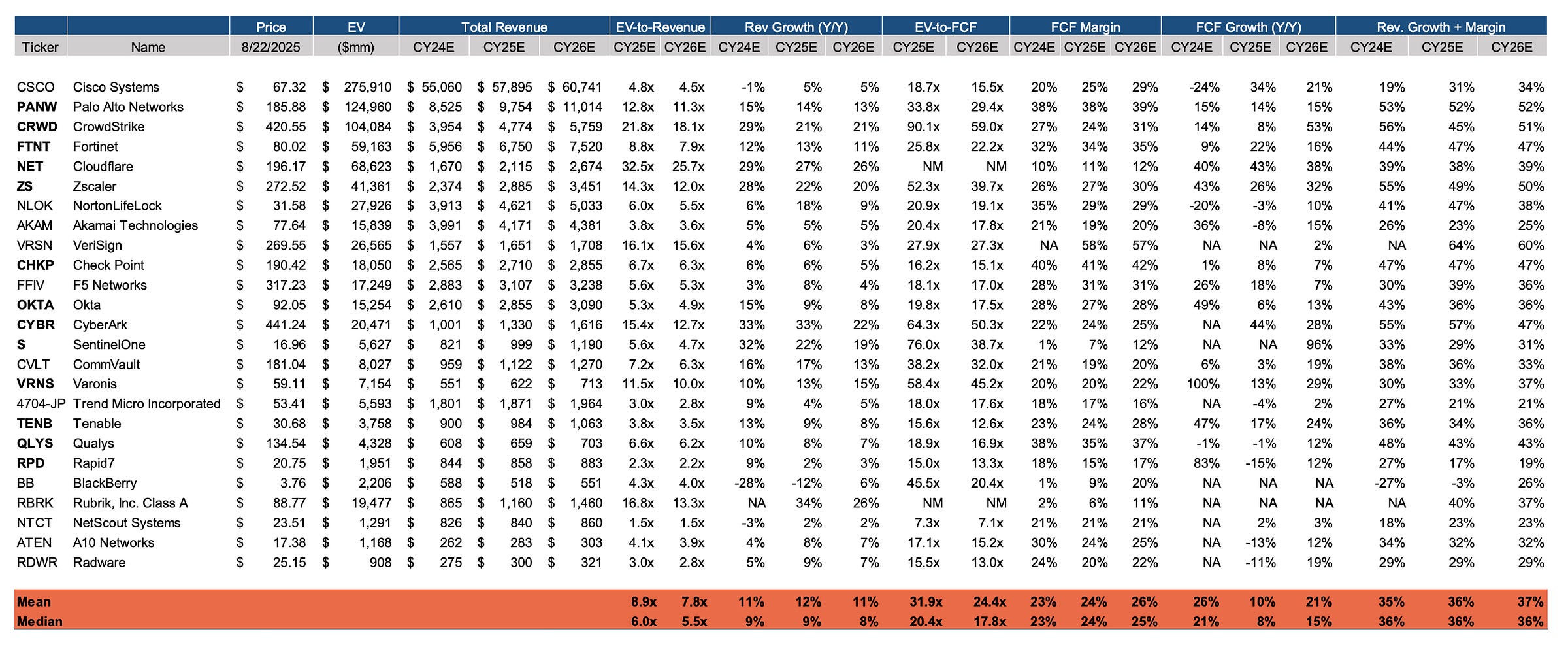 Comping to public peers. According to our cybersecurity comp group above, provided by Wolfe Research, the median company trades at a 7x multiple on 2026 revenue. The median company is only expected to grow revenue in 2026 by 11%, however.