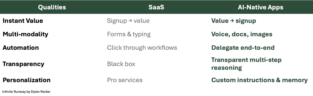 As I wrote in Raising the Bar, AI-native software products have several ways in which they differ from traditional SaaS applications.