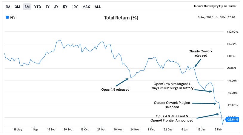 Negative reflexivity and capital outflows. Over the last two years capital has flowed out of software and into AI infrastructure, semis, energy, and the mag7. Multiple compression fuels the bear narrative, driving more selling, and creating a vicious cycle with no catalysts to reverse this trend.
