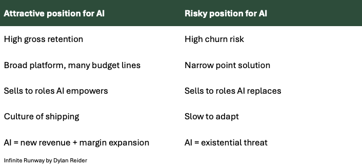 The Have-nots. These companies sell narrow point solutions, have relatively higher churn, sell to user bases whose jobs are in the crosshairs of automation, and lack the leadership and culture to ship or buy their way to a meaningful AI product. They lack deep proprietary data.