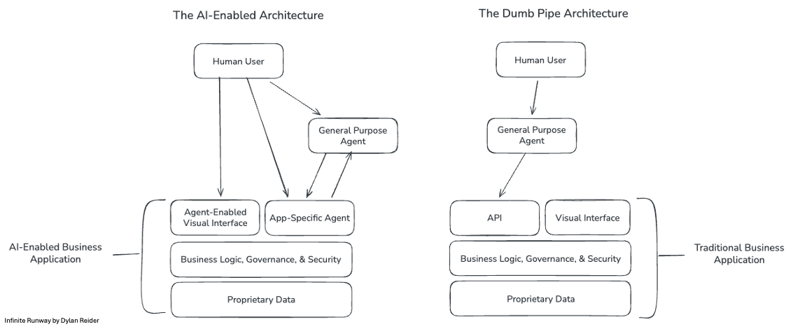 Are AI agents becoming the new interface layer or “home screen” for where work gets done? In the future, will we just access all of our apps via an AI agent that can interact directly with the app’s underlying data, rendering software providers as “dumb pipes” that store data and feed it to agents?