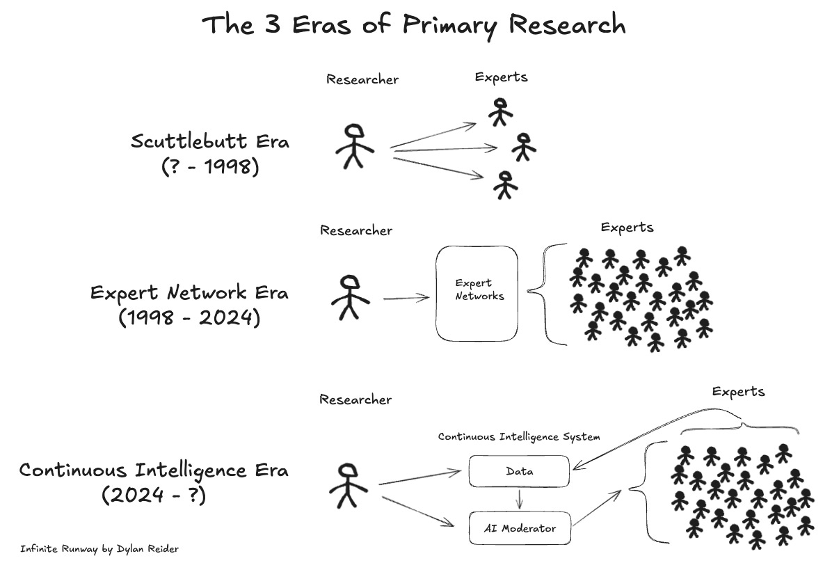 As the models get better and the dataset gets larger, the AI will get better at identifying what answers don’t exist yet, and what questions to ask them. And that intelligence will live inside the workflows of every firm that used to buy expert calls one at a time.